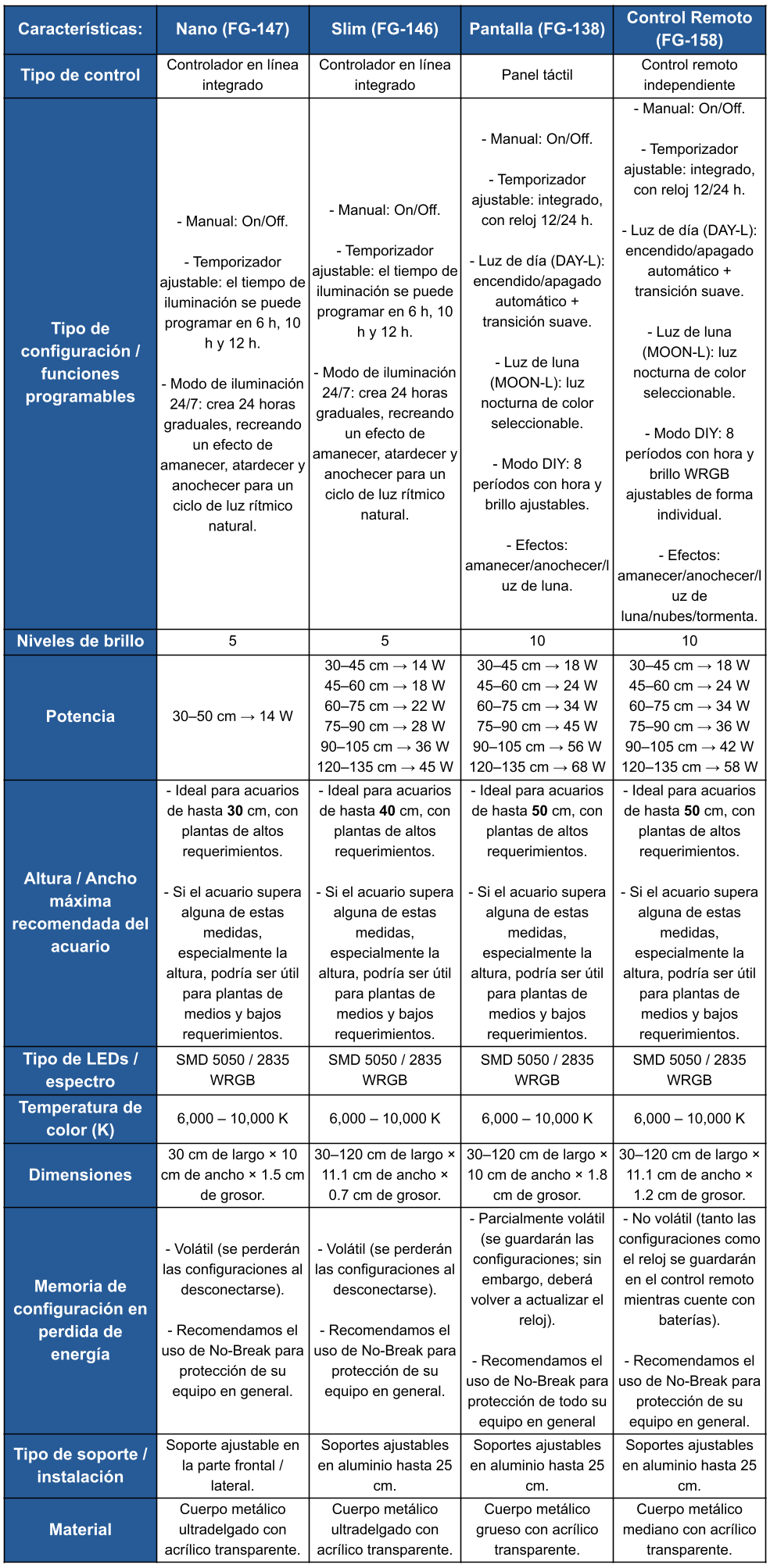 Tabla comparativa entre modelos de lámparas AQUATREUM