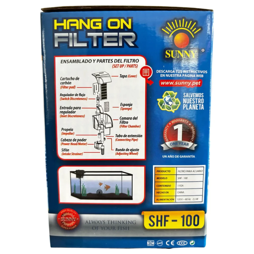 Sunny SHF-100 es un filtro de cascada mini para acuarios que ofrece filtración eficiente y caudal de 160 L/h con bajo consumo (2.5 W) en 120 V / 60 Hz.